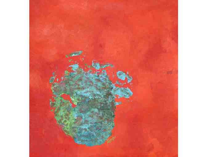 This painting is unique, special and original and was created with tremendous patience, subject entirely to Wally's decision to participate in the process, largely influenced by bananas, dates and other treats!  Alpana painted the background and Wally stepped on the canvas to leave his footprint.