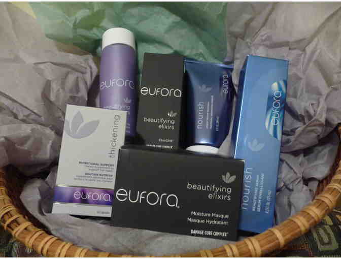 Eufora has built its success by providing unique, top performance "People and Planet Friendly" products exclusively sold through independent and carefully hand picked salons. This package includes six of the top hair care products in their line. Beautifying Elixir Moisture Masque and ElixirONE hair treatments, Nourish Urgent Repair Treatment and Beautifying Serum, Bodifying Shampoo, and Hair Thickening Supplement.