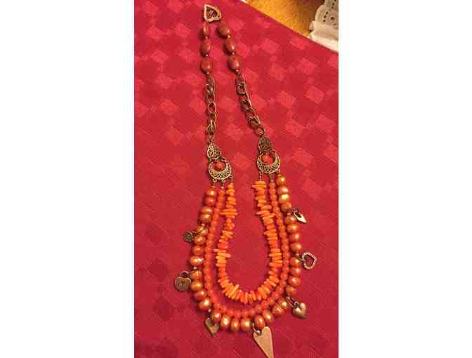 Hearts on fire necklace. Orange coral and fresh water pearls with copper.