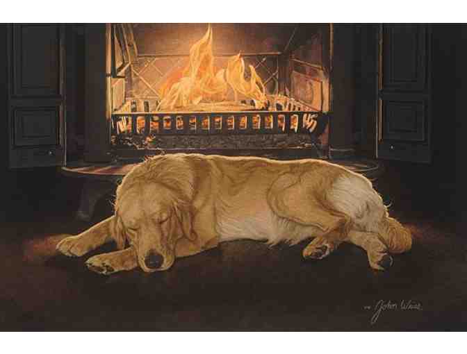 "There's nothing like sitting by the fire, with your loyal dog curled up at your feet, for real sense that all is right with the world. Did you ever notice that goldens can lie in the snow with their faces buried, yet they never seem to get cold? Then they come into the house and lie so close to the flames you think they're going to catch fire. Neither extreme seems to affect them and that's why I placed this golden so close to the fireplace.