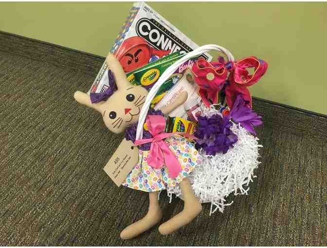 Basket includes craft supplies and coloring books with sticker, Room to Bloom Gift Certificate, Connect4 game, and completely handmade bunny with handmade clothing.