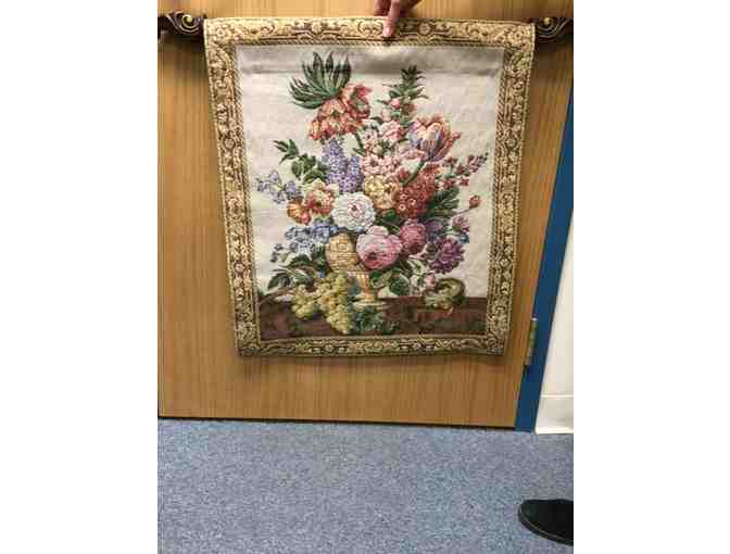 One 26 x 29" lined, woven floral tapestry with decorative rod.