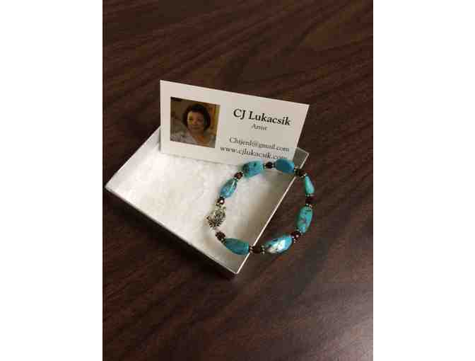 Artist Chijen Lukacsik-designed turquoise, garnet bracelet with pewter findings. size 7.5"