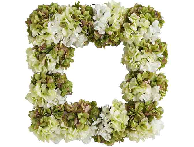 Exclusively handcrafted hydrangeas in shades of moss, ivory and celadon are clustered to create a remarkable statement for your covered door or mantel. For once, squares have all the fun.