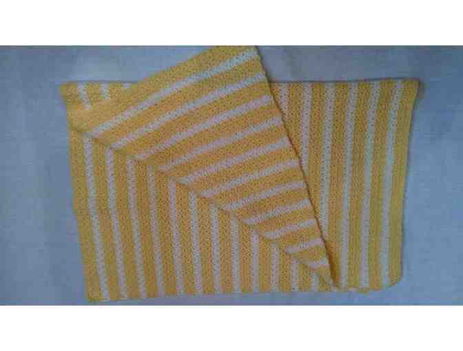 This package includes a beautiful handmade 36 inch by 30 inch crocheted baby blanket that is the perfect size and weight for baby's crib. It is crocheted of soft acrylic which also makes it easy care. Machine wash.
