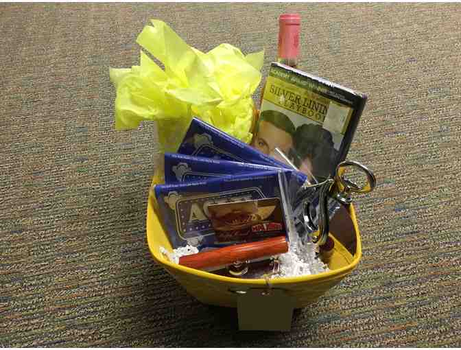 This movie night basket includes a $20 gift card to Papa John's, bottle of white zinfandel, 2 wine glasses, 3 bags of popcorn, a movie (Silver Lining Playbook), and Kitchen Utility Set includes Stainless Steel Pizza Cutter, Bottle Opener and Jar Opener.