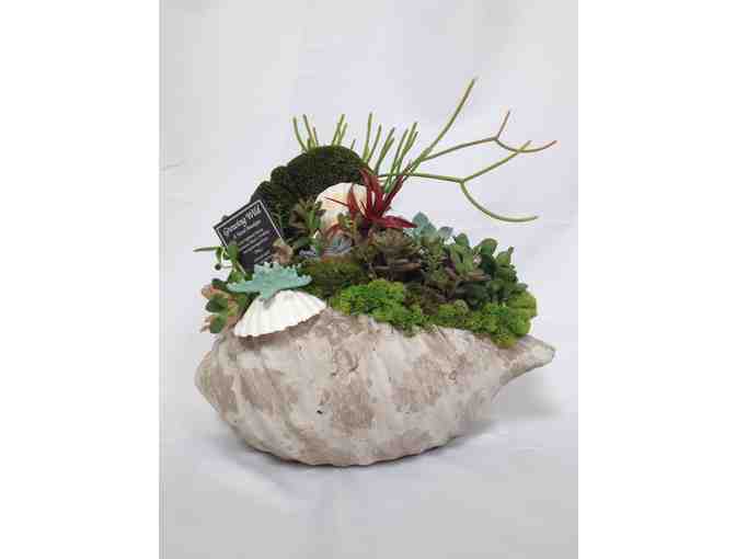 A large fresh succulent garden in a ceramic clam shell with a natural sea fan and adorned with seashells. Approximate dimensions: 16" wide, 12" deep and 16" high.