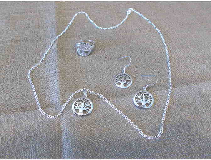 Think "Greenwood" with these beautiful pieces! Complementary tree designs in earrings, ring (size 8) and pendant in dazzling sterling silver.