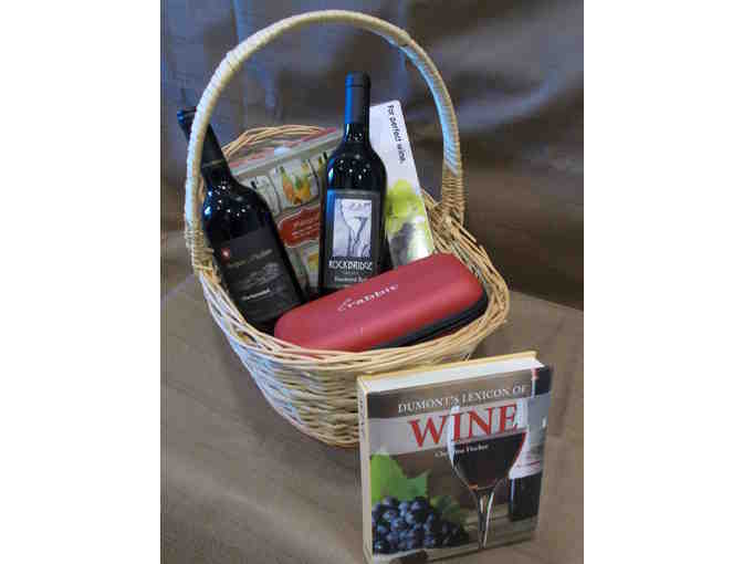 Get ready to entertain with this wine gift basket featuring 2 bottles of red wine, an aerator and bottle stopper, helpful wine lexicon, and charming appetizer plates.
