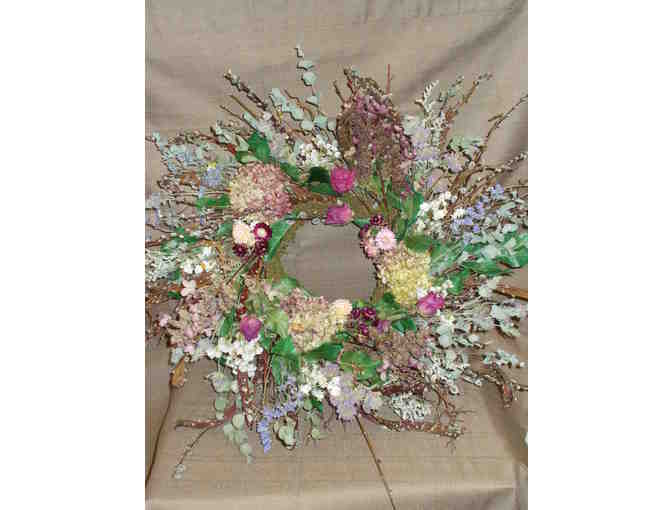 Compliments will come your way when you place this beautiful wreath inside your home. Handcrafted on a pussywillow base it features various dried natural spring and summer blossoms.