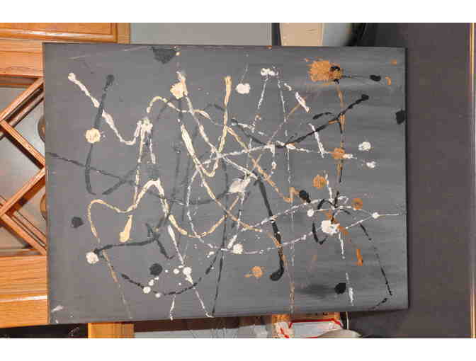 Kindergarteners studied a science unit called Forces and Motion. Through classroom investigation students learned all about forces, gravity, pushes, pulls and collisions. Students applied their knowledge about motion and gravity to create these abstract pieces of art. The lines were created by the movement of marbles, and the splatters were made by the force of gravity. 18" x 24"