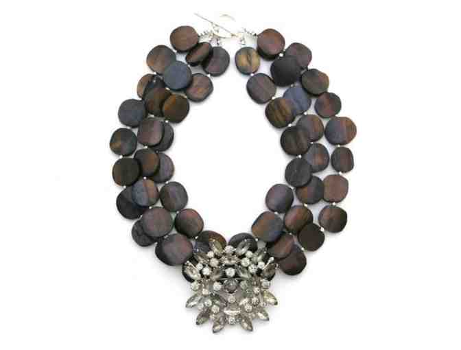 Winner will receive a bone necklace from Elva Fields. Bone beads from Kenya have been tinted and burnished, creating a mahogany-like look for three strands of beautiful beads; quite the backdrop for a vintage rhinestone brooch, itself showing the striking patina only age can bring. Mixed in are faceted Indian silver beads to continue the subtle hint of sparkle throughout the design, and a hammered silver toggle clasp from Thailand completes the look at back. The necklace measures 18" in length. Elva Fields Jewelry is the result of unusual vintage and antique pieces reconfigured and incorporated in unexpected, timeless designs.