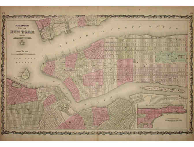 Winner will receive Johnson's Map of New York and the Adjacent Cities from Johnson's New Illustrated (Steel Plate) Family Atlas, New York: 1864. This detailed large map of Manhattan and parts of Brooklyn, Jersey City and Hoboken, is set within an elaborate Victorian foliate border. Manhattan is shown from Battery Park to 88th Street. Governors Island, Ellis Island, the U.S. Cob Dock and Blackwell Island (later renamed Roosevelt Island) are also shown. An inset map in the lower right titled, "Continuation of the City & County of New York on a Reduced Scale" shows the rest of Manhattan from 86th Street north. The map of Brooklyn includes the downtown area surrounding the Navy Yard, as far south as Red Hook and as far north as Williamsburg and Greenpoint.