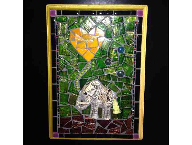 This bid is for a one-of-a kind mosaic made with wood, tile, grout and a sweet elephant adornment. Brilliant tiles sparkle when the light hits them. This item is ready to hang or display.