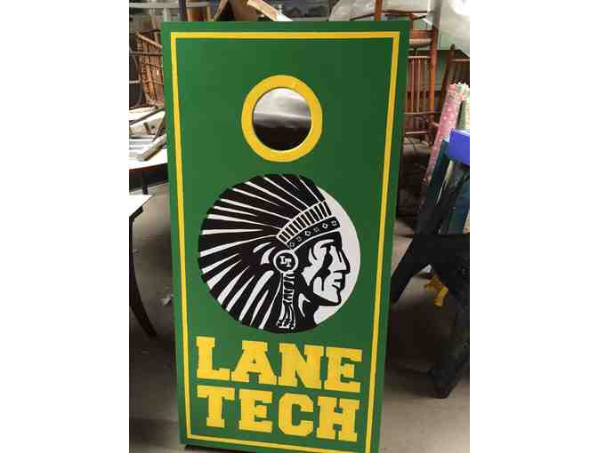 One-of-a-kind Lane-themed cornhole set carefully crafted by Lane parent, Dan Zolkowski, a master carpenter, and hand painted by Lane parent/designer Alisa Trumbull and Lane parent/artist Amy Williamson.