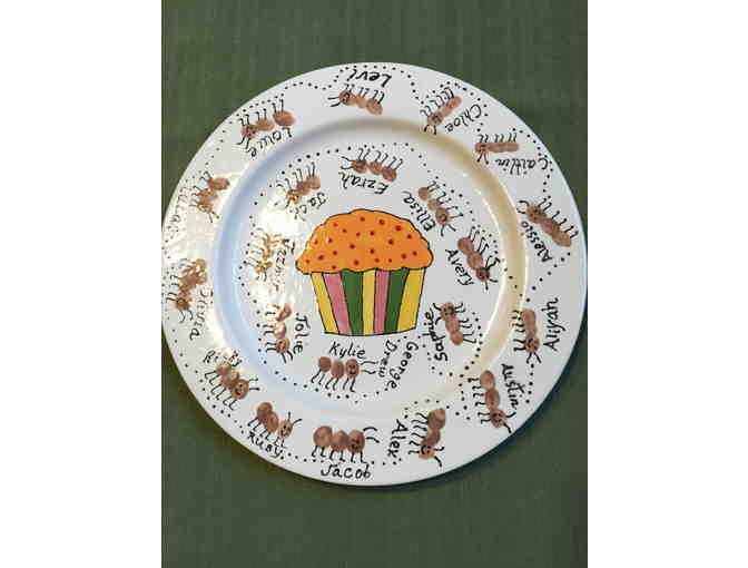 This plate has been touched with love by each kindergartner. A parent volunteer worked with each student to help them press their fingers or thumbs onto the plate and capture their fingerprint as a special keepsake for their class. Then little outlines were added to each fingerprint transforming them into bees, butterflies, fishies, monkeys, ants, etc., according to each theme the kindergarten teachers picked for their class. Names were added to help you identifiy your childs fingerprint impression.