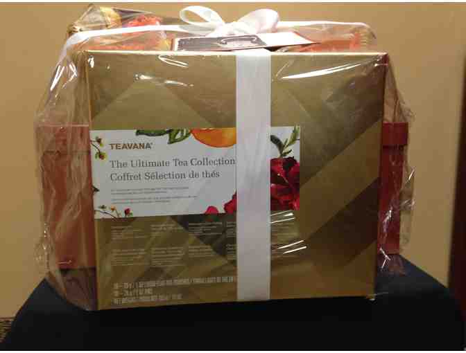 Basket includes: White Orchid Tea Pot Set (includes teapot, lid, 4 teacups, 4 saucers); Teavana Ultimate Tea Collection (includes 10- 1 oz. loose leaf tea selection with storage tins); Walnut Tea Service Tray, and Teavana Signature Blends Collection (includes 4-2oz. loose leaf tea selection with storage tins and 1 lb. bag of rock cane sugar.)