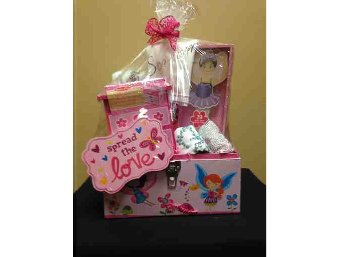 What little girl wouldn't love this package? 3-6 month outfit, Two size 4 bedazzled tshirts, Melissa & Doug wood dolls, Melissa and Doug arts and crafts chest.