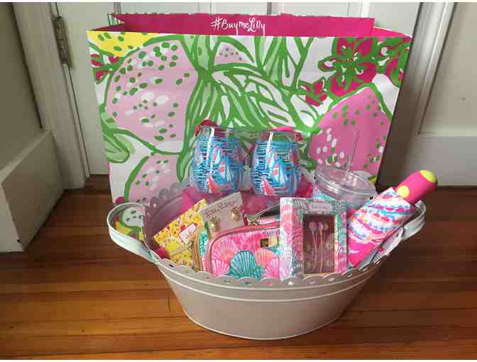 an umbrella, wine glasses, ear buds,drink tumbler, a cosmetic bag, pineapple earrings and a $50 gift card to Anchored in Pink, a Lilly Pulitzer Signature Store, Newport RI