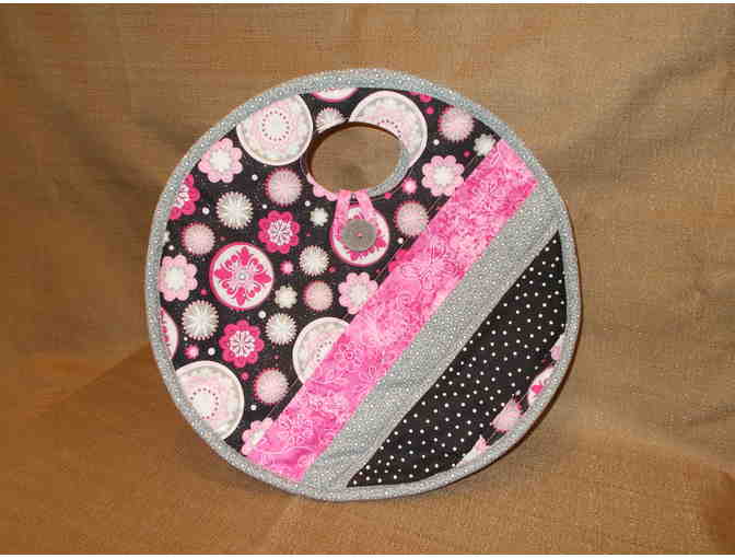 Unique round handbag quilted in pink, gray and black hues was lovingly made by the Doerschler children's grandmother.