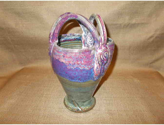 Uniquely designed 3-handled pottery vase in hues of green, blue and deep red will look lovely filled with spring and summer flowers.