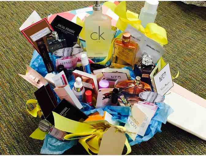 This large perfume basket features CK One, Endless Euphoria by Calvin Klein, Eternity Aqua by Calvin Klein, Gucci Flora, Calvin Klein Euphoria, Clarins Eye Makeup remover, Clarisonic, Clinque Repairwear, Clinque Lotion, and many more store brands and samples.