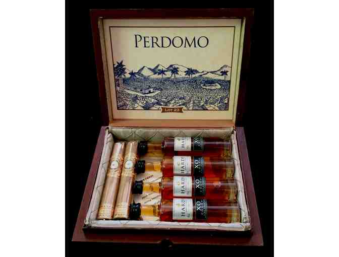 Wood cigar box has been artfully repurposed with elegant fabric and handpainted as a men's dresser valet to hold cufflinks, watches, and treasures. The artist has included two exquisitie cigards by Perdomo and four bottles of Hardy XO Cognac miniatures.