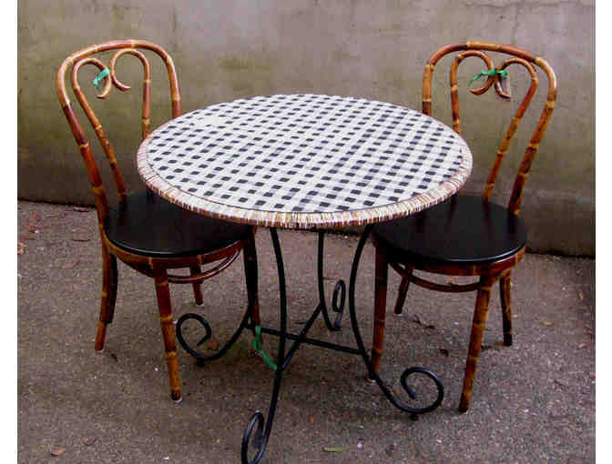 This charming set includes a wrought-iron bistro table that has been skillfully detailed with a fringed black and white tablecloth and a whimsical Bill-of-Fare! The two bistro chairs sport black wooden seats and are embellished with faux burnt-bamboo painting. All items are handpainted and signed by the artist.