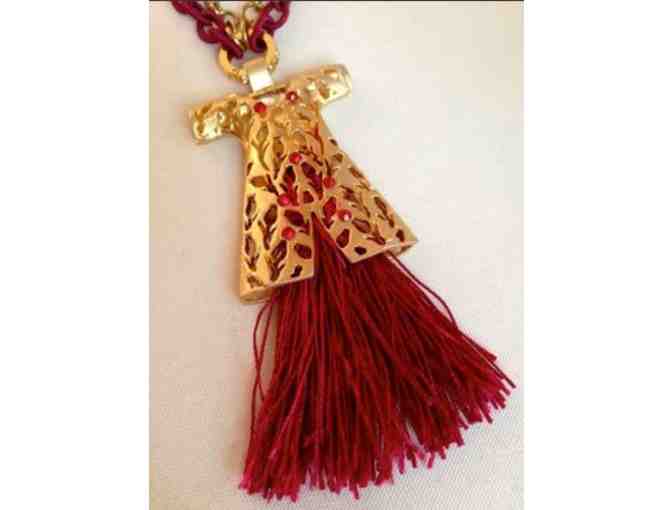 Elegantly simple, this necklace features a "caftan" in 24K yellow gold vermeil over silver, measuring 2"x4" including its red silk tassel "skirt." The caftan is studded with red Swarovski crystals. This unique necklace feature a double chain - one silk, the other gold vermeil - 28" long and closes with an elegant hook clasp fashioned in the same metals as the caftan. The tassel is a cabernet red silk.