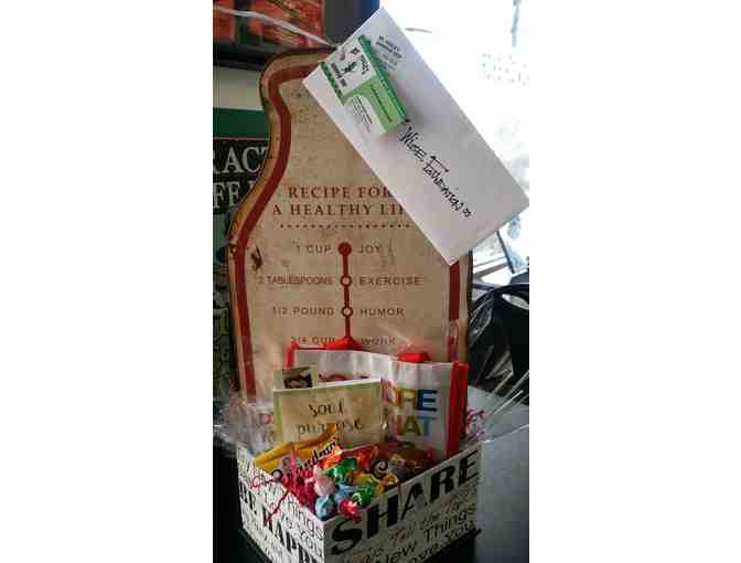 Enjoy this gift basket with an adult large Mr. Pickle's sweatshirt, a gift certificate for $20 to Mr. Pickles, a large Reciepe for a Healthy Life Sign, the book Soul Purpose, Finding the Courage to Fly by Krista Gawronski, a journal notebook and lots of little goodies all presented in a cute little box.