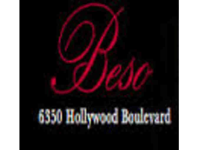 Date Night Hollywood Style! Dinner for 2 at Beso Restaurant. Beso Restaurant is the high-end hot spot owned by Eva Longoria. Beso serves Pan-Latin & steakhouse eats in a lush setting! Dinner includes one appetizer, 2 signature drinks, 2 entrees and dessert! Bid and enjoy!