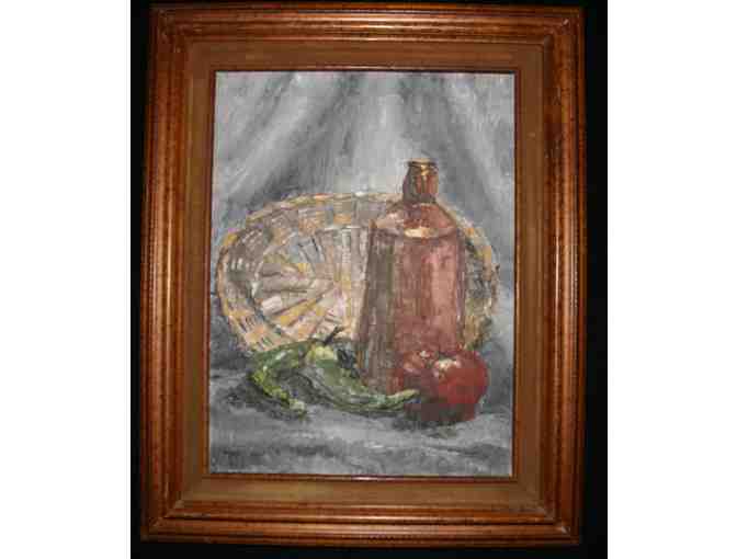 This item is a still-life painting done in oil a palette knife. The paint is laid on thick, giving the texture called "impasto."
