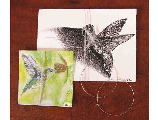 The winning bidder will enjoy these delicate silver hoops, fabricated by the artist, as well as two original drawings of hummingbirds, one in black pencil and the other in color pencil and watercolor.
