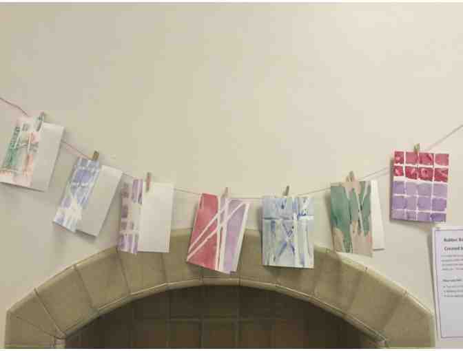 To create these usable works-of-art, our students wrapped rubber bands around their cards, sponged on watercolor paint, and removed the rubber bands when dry. This beautiful stationary is the result.