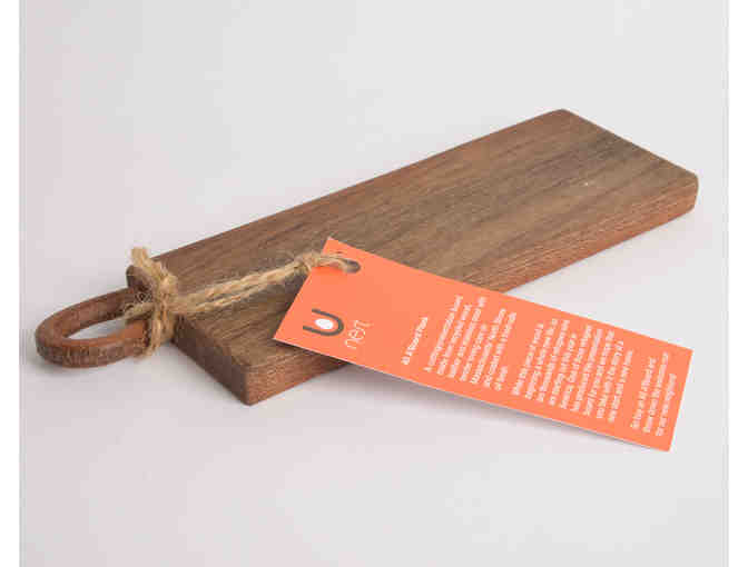 This cutting/presentation board was made from recycled wood, leather and stainless steel with tender loving care in Gloucester, MA by Waring seventh grader, Cole Sauder. It measures 3" x 9" and is coated with a food-safe oil finish.