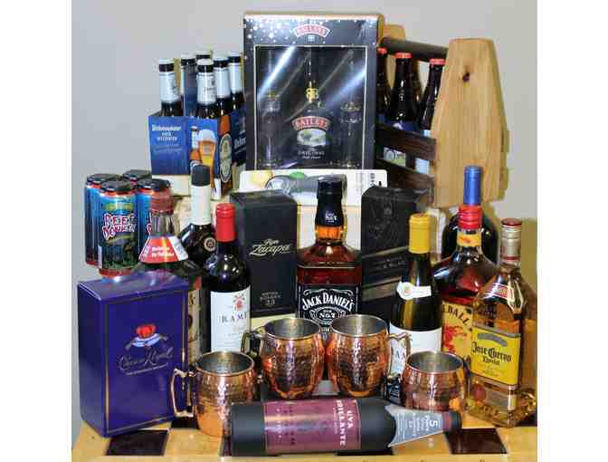Includes an assortment of wine, beer and liquors, including Fireball Cinnamon Whiskey, Tito's Vodka, Crown Royal, plus 4 Moscow Mule Mugs, a wine accessory gift set and much MORE!!!