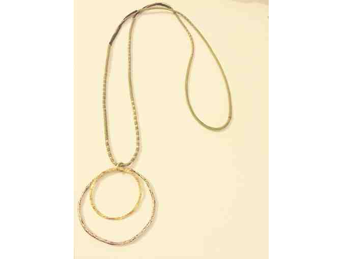 Necklace by local jewelry designer Wendy Stillman. Hand carved sterling silver large circle with hammered gold ring on long gold chain.