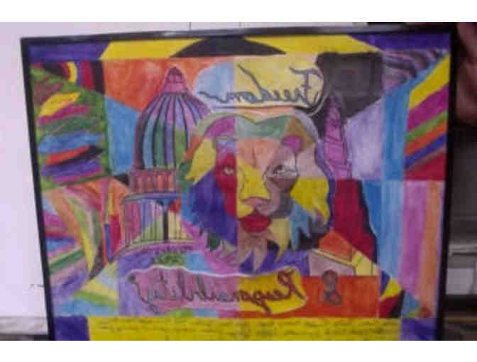 This is a mural the students decided represented our community at Capitol Hill Montessori @ Logan the best: The Monarch lion (our mascot), the pink tower (Montessori primary material), and the Capitol building. Each student selected a portion of this mural to design and paint with watercolors and give it their own personal style.