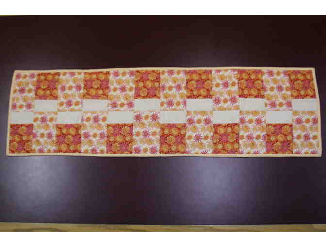 The Bright Flowers Runner Quilt was made by Stitched by Lola. It measures 13.5 by 45.5 inches, with unique and intricate designs and patterns on both sides, and is made of quilting quality cotton. It has not been washed but is washable in cold water.