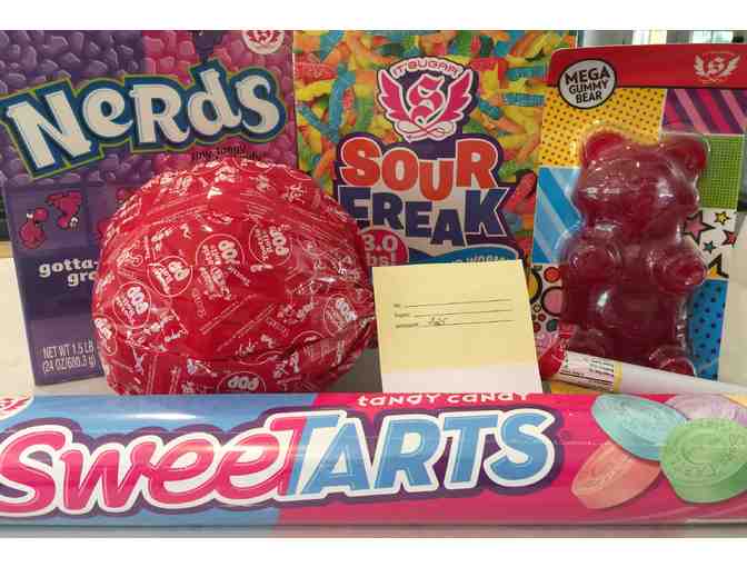 A medley of oversized favorites that will make any kid's (or adult's) mouth water! A 2 LB Gummy Bear, Sour Freak Gummy Worms, World's largest giant tube of Sweet Tarts candy, Giant Nerds, Giant Tootsie Roll Pop, and a $25 Gift Card.