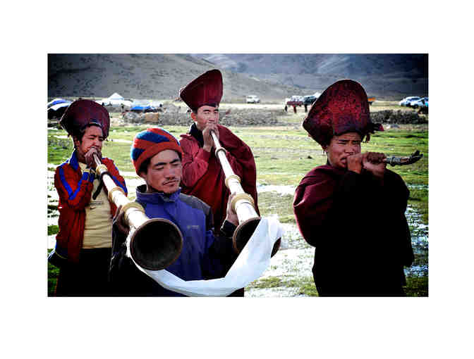 Description: Monks playing horns at the end of the horse races celebrating impermanence. At this time, the trophy for the race was being burned.