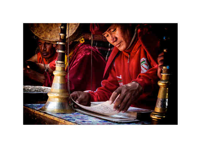Description: High in a Himalayan valley, deep in a dugout nomad tent, we studied this smoky ceremony. Tibetan script was delicately inked on the stacks of paper stained with age. The monks chanted and played music in this thick sultry space. I sat inside the tent, but without understanding their words I felt like I was still outside.