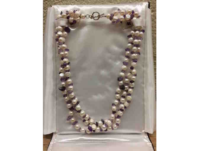 A triple strand of alternating pearls and rough-cut amethysts make this statement necklace chic and elegant.