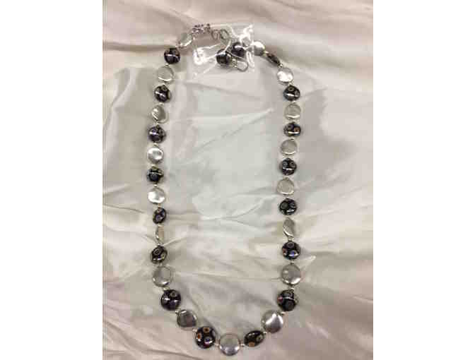 This amazing 18" necklace features alternating black Czech Glass peacock coin beads and silver plate coin beads, and comes with matching earrings.