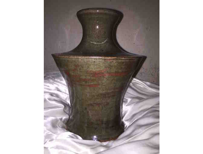 This handmade stoneware vase features soothing earth tones of green/brown and rust.