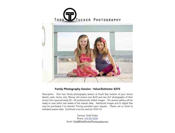 One hour family photography session at South Bay location of your choice (beach, park, home, etc). Winner will receive one 8x10 and two 5x7 photographs of their choice from approximately 20 - 25 professionally edited images. The session gallery will be ready to view within two weeks of the session date. Additional images and or digital files may be purchased if so desired. Pricing provided upon request. Please call or email to schedule session date. Certificate must be used by 12/31/15.
