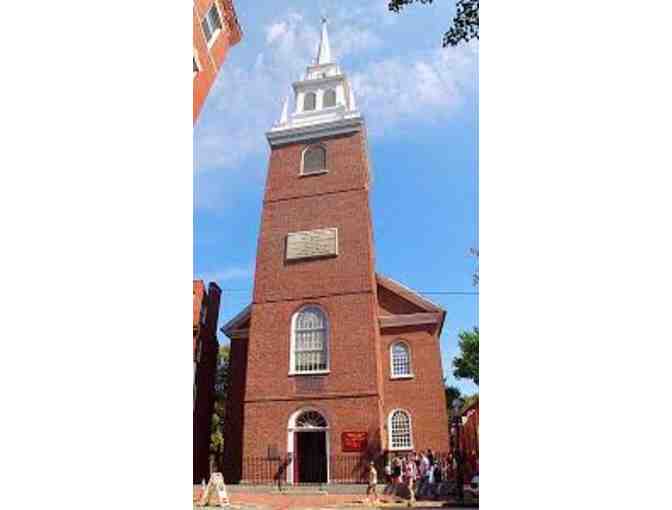 An assortment of goodies from the gift shops at Old North Church, including a Freedom Trail Pop-up Book, Colonial Chocolate and recipes, t-shirt, and 6 passes for a Behind the Scenes Tour.