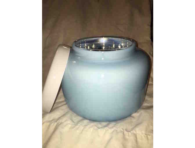 This blue glass cachepot will be at least as beautiful as any flowers or treasures you put in it! A beautiful addition to any room.
