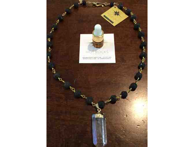 Bizi Necklace from Hot Rocks! Natural lava rock suspends a gorgeous quartz crystal and is paired with essentail oil to become a personal diffuser! Smoke oil is included!