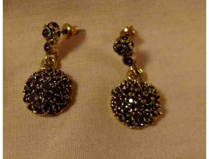 Up for auction is this pair of purple stone round drop earrings. Measures 1/2" round and 1-1/8" long.
